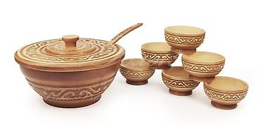 - Большая миска-черпак с крышкой и длинной ручкой; шесть пиал. Классический орнамент по борту, плавные формы, двуцветная тонировка, аккуратная подгонка крышки.