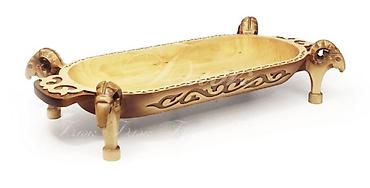 - Авторское блюдо на четырёх ножках с резными головами баранов по углам; глубокая чаша, устойчивое основание.