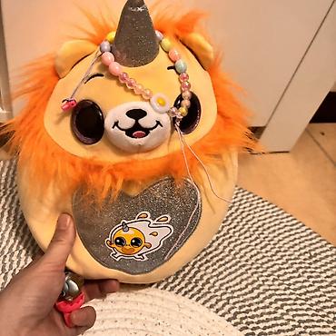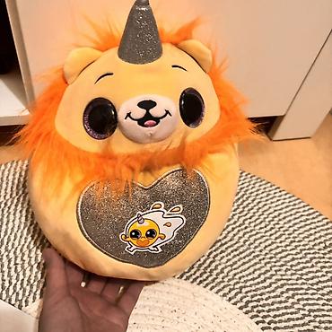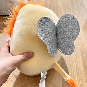 - Мягкая плюшевая подушка‑игрушка “львёнок-единорог”: круглой формы, с ораньевой гривой, блестящим рогом и сердцем на животике из серебристой ткани; на сердце — наклейка с мультяшным персонажем.