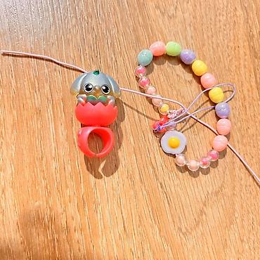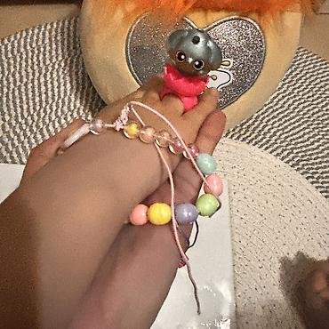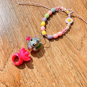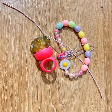 - Браслет на шнурке с крупными бусинами пастельных оттенков (розовый, лиловый, мятный, жёлтый, персиковый) и прозрачными шариками; декоративный шарм в виде яичницы.