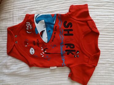 - Красный боди с коротким рукавом и принтом «SHARK» и морскими персонажами. Застёжки-кнопки на плече и внизу для удобного переодевания.