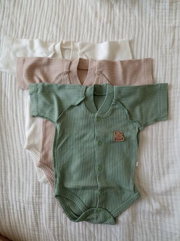 - Рубчик три боди с коротким рукавом: зелёный, бежевый и молочный.