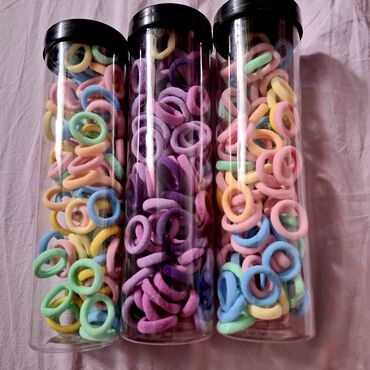 - Набор разноцветных резинок для волос в прозрачных тубусах с крышками — множество штук пастельных и ярких оттенков.