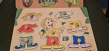 2) Тема «Одень девочку» — фигуры одежды и обуви с деревянными ручками: футболки, куртка, штаны, юбка/шорты, ботинки; центральная фигурка девочки. Помогает учить части одежды и мелкую моторику.100 сом