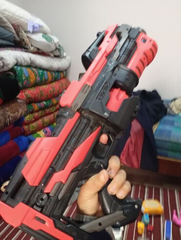 - Игрушечные бластеры/автоматы для мягких пуль: крупный красно‑черный, сине‑оранжевый X-Hero с вращающимся барабаном, компактный пистолет с ярким графити-принтом, синий карабин с красной рукояткой.