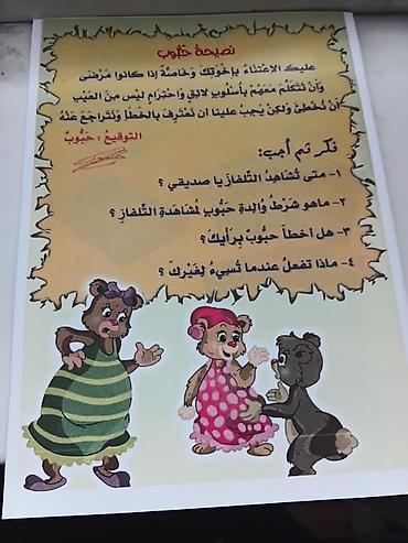 - Разворот с рубрикой «نصيحة حبوب» («Совет Хубуб») и вопросами для обсуждения, с рисунками медвежат — развивает навыки чтения и понимания текста.