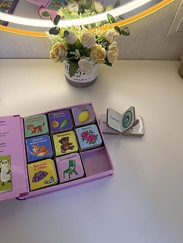 - «Мини-книжки для малышки» — набор из 9 книжек-кубиков в коробке. Темы на карточках: домашние животные, дикие животные, фрукты и овощи, цветы, игрушки, одежда и обувь, в комнате и др. Удобный небольшой формат для маленьких рук, помогает расширять словарный запас, развивать память и внимание.
