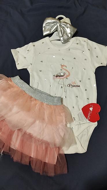Детская одежда для девочек – комплект и футболки с принтами. 1) Праздничный комплект для малышки: - Боди молочного цвета с коротким рукавом и принтом “little princess”: фламинго, серебристые серде...