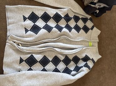 - Кардиган/кофта на молнии светло‑серая с ромбическим узором (аргайл) темно‑синего цвета; высокий ворот, эластичные манжеты и пояс.