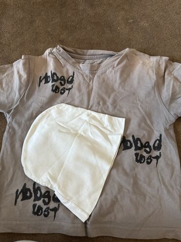 - Футболка серого цвета с принтом “robbed lost” спереди и сзади; V‑образный вырез. В комплект к футболке — светлая хлопковая шапочка-бини.