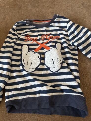 - Джемпер в синюю и светло‑серую полоску с вышивкой “Boys Player” и аппликацией в виде перчаток; трикотажные манжеты и низ.