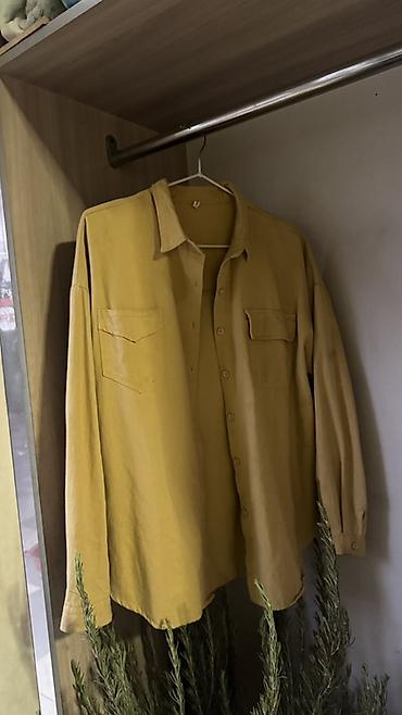 4) Рубашка женская (или подростковая) свободного кроя, горчичного цвета. Классический воротник, застёжка на пуговицы, два нагрудных кармана, длинные рукава на манжетах. Подходит как самостоятельный слой или как лёгкая накидка. 150