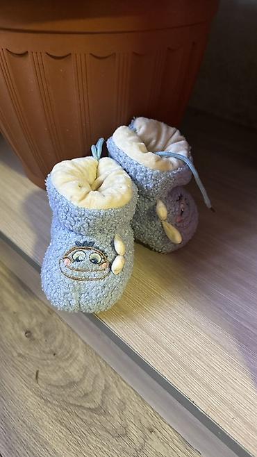 3) Пинетки для малыша, тёплые, голубые. Мягкий плюшевый материал с подкладкой кремового цвета, шнурки-утяжки, вышитые мордочки и декоративные элементы по бокам.0-6мес .300с