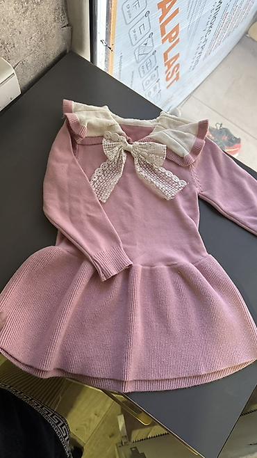 1) Платье для девочки, трикотажное, розовое. Длинный рукав, расклёшенная юбка с широкими складками. Воротник-«матроска» молочного цвета с рюшами, на груди крупный декоративный бант из кружевной ленты. 3-4года. 450с