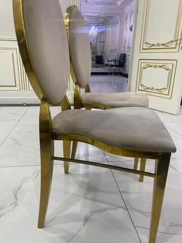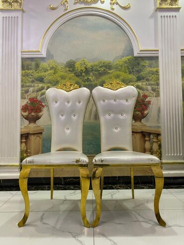 Размеры визуально: стандартные обеденные (высокая спинка, стандартная высота посадки). Подходят к столам классического и современного стиля с золотистыми или мраморными элементами.