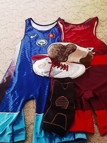 Идеально подходит для тренировок и соревнований по вольной/греко‑римской борьбе, грэпплингу и другим единоборствам на ковре. Размеры не указаны на фото; в комплекте — два трико, пара борцовок и наколенник. Цвета и логотипы соответствуют изображению.