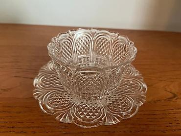 - Прозрачная стеклянная креманка с блюдцем. Рельефный орнамент с ромбами и арками, волнистый край, блюдце с лепестковидной формой — подойдет для подачи варенья, конфет, мороженого или как декоративная фруктовница/подсвечник.