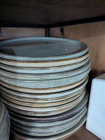 - Стопка крупных обеденных тарелок в сканди-стиле: светлая глазурь с контрастным кантом, плоская форма, широкое поле подачи.