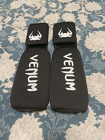 - Пара щитков/защит для голеней и подъёма стопы Venum (эластичные чёрные), с интегрированной амортизирующей вставкой и логотипом Venum.