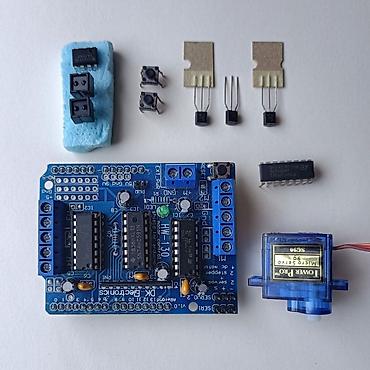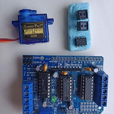 - Плата Motor Shield для Arduino (HW-130, DK Electronics) — управление 2 шаговыми/2 DC моторами и 2 сервоприводами; клеммные колодки M1/M2, разъёмы SERVO1/SERVO2, кнопка RESET, индикатор LED, вход EXT_PWR (+5V/GND/9V).