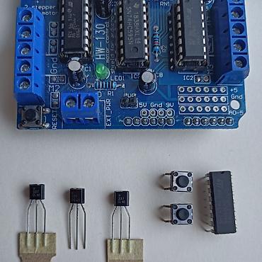 - L293D (двухканальный драйвер моторов, 2 шт. установлены на шильде).