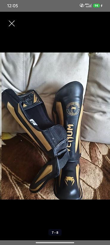 - Щитки на голени и подъём стопы Venum (черные с золотым): удлиненная форма, многослойный наполнитель, широкие ремни‑липучки, эргономичная колодка.