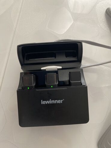 - Беспроводная микрофонная система Lewinner: зарядный кейс и два передатчика‑микрофона с индикаторами (зеленые LED). В кейсе — отсеки для двух капсюлей и приемника.