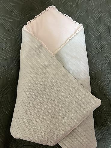 - Конверт/плед для выписки и прогулок. Внешняя сторона — светлая с рельефным узором «ёлочка», внутренняя — гладкая светлая подкладка, по краю декоративное кружево. Можно использовать как плед или конверт за счёт удобной укладки полотна.