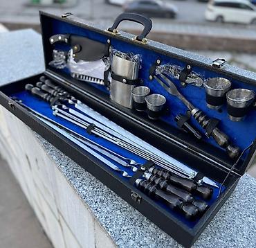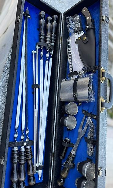 Кейс: жесткий, с ручкой и замками, внутренняя отделка бархатистого синего цвета, внешняя фактура под кожу. Удобно брать на природу, рыбалку, в поездки: все инструменты компактно закреплены и защищены. Материалы — металл и дерево, нож и шампуры из нержавейки, рукояти эргономичные. Отличный комплект для приготовления шашлыка и сервировки на выезде.