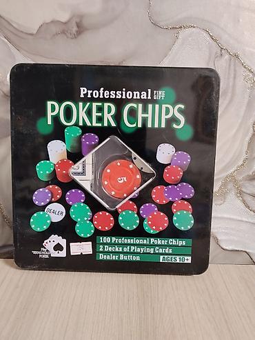 - 100 профессиональных покерных фишек разных номиналов (1, 5, 10, 25 и др.; цвета: белый, красный, зелёный, синий).