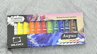 - Краски акриловые MALEVICH, набор базовых цветов: 12 тюбиков по 12 мл. Палитра включает жёлтые, оранжевые, красные, зелёные, синие, коричневые, чёрный и белый — подходит для смешения и создания широкого спектра оттенков.