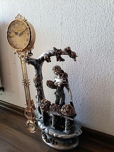 - циферблат круглой формы с римскими цифрами, золотистая отделка, маятниковый узел и декоративные элементы.