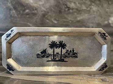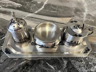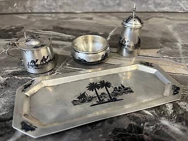 Редкий набор солонка, перечница и горчичница (емкость для лазы/лазджан) на подносе из серебра 925 пробы. Изделия выполнены иракским мастером середины XX века в традиционной технике ручной гравировки и глубокого чернения, характерной для серебряного ремесла Месопотамии. Посуду украшают караваны верблюдов, парусники дхау, мудхифы арабов, пальмы, руины Так-и-Кисра и мечеть великого имама Абу Ханифа ан-Ну'ман в Багдаде! Историческую ценность набору придаёт дарственная гравировка на подносе.