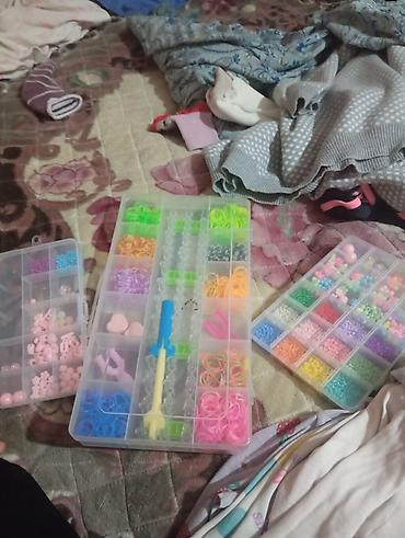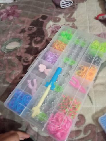 - Большой комплект резинок для плетения браслетов (разноцветные: розовые, салатовые, оранжевые, голубые и др.), пластиковая мини-станция/платформа для плетения, крючок, вилочки-держатели, клипсы-застёжки.