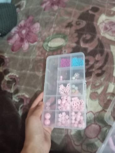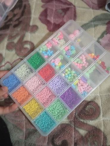 - Два бокса с бисером и бусинами разных форм и размеров: мелкий круглый бисер, крупные бусины, фигурные элементы (цветочки, сердечки, звёздочки и др.), буквы, разделители. Богатая палитра пастельных и ярких оттенков.