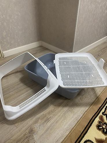 - Туалет для кошек с решёткой и съёмным бортиком. Конструкция из трёх частей: глубокий поддон, внутренняя перфорированная вставка для просеивания наполнителя, верхний бортик для защиты от разбрасывания. Удобно мыть и собирать.