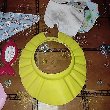 - Защитный козырёк для мытья головы (жёлтый). Мягкий эластичный материал, регулировка по окружности, защищает глаза и уши от воды и шампуня.