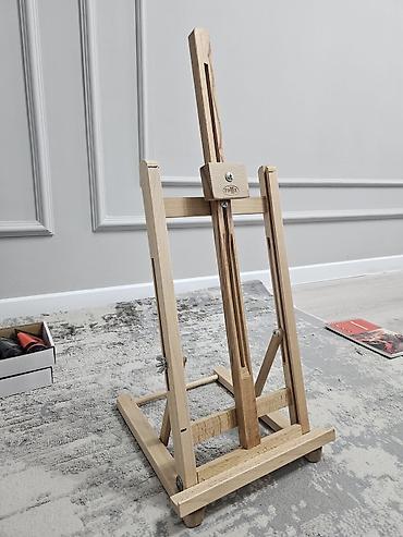 - б/у Настольный деревянный мольберт-тренога с регулируемой высотой прижимной планки и наклоном. Устойчивая основа, металлические фиксаторы, подходит для работы сидя и для выставки готовых работ (1500 сом)