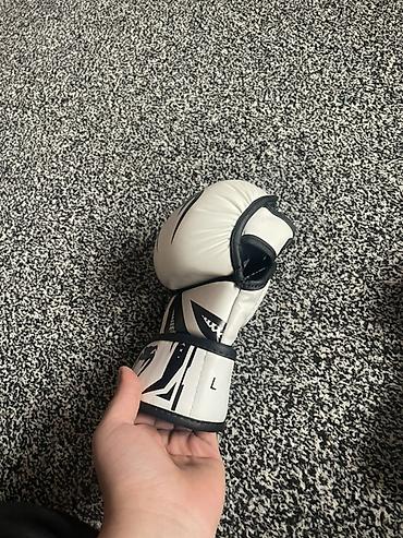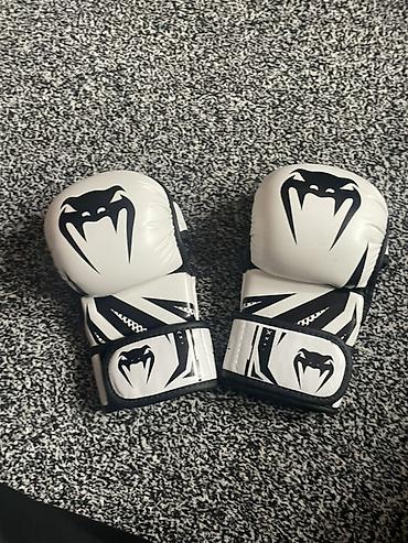- Боксерские перчатки Venum (бело‑черные). Плотный слой пены для защиты кисти и кулака, широкая манжета на липучке для фиксации запястья, вентиляционные отверстия на ладони, прочное покрытие, фирменная графика Venum.