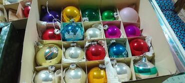 - Разнообразные стеклянные шары и фигурные подвески классической ручной росписи/напыления: глянцевые однотонные (красные, синие, зелёные, золотые, серебристые, фиолетовые, розовые), а также с рисунками — олени, зимние пейзажи, снежинки, геометрические узоры.