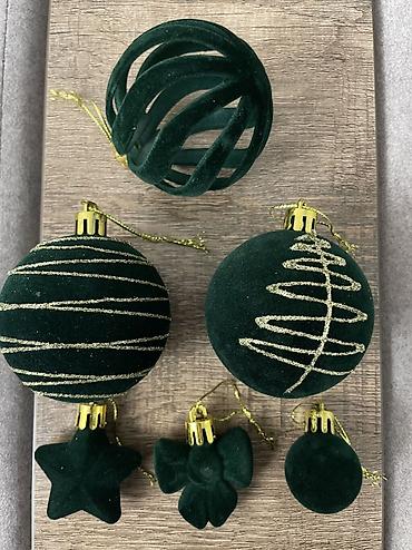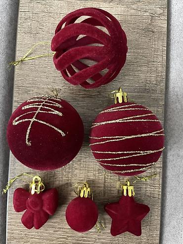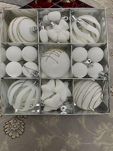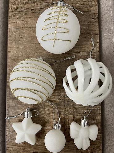 - Комплектация каждого набора: шары разных диаметров и фактур (матовые/с блёстками, с золотым/серебряным узором), фигурные подвески (звёзды и др.), декоративные полые «спиральные» шары.
