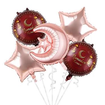 - 2 круглых шара с тематическими принтами («Ramadan Kareem» или «Eid Mubarak», луна, фонари, мечеть)