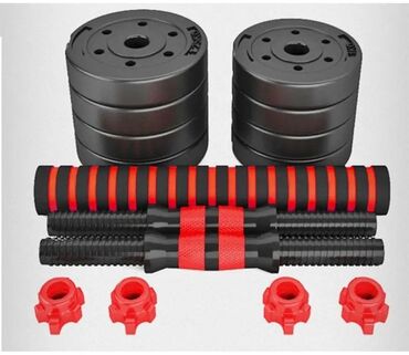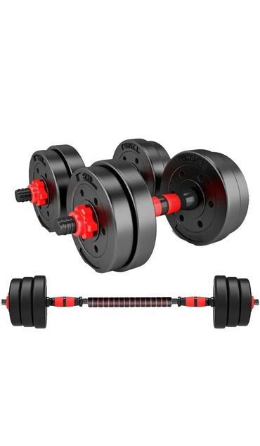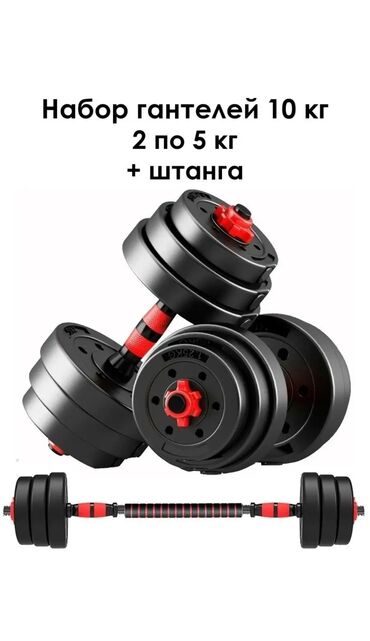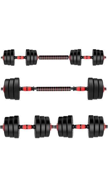- Универсальный набор: две гантели по 5 кг каждая, соединяются в штангу при помощи центрального грифа.