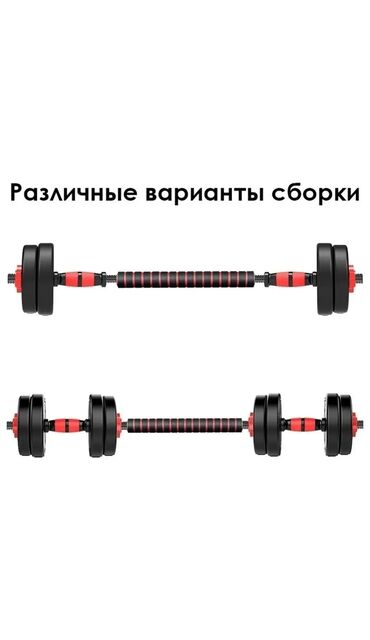 - Разные варианты сборки: две раздельные гантели, гантели с разнесёнными блинами, единая штанга.