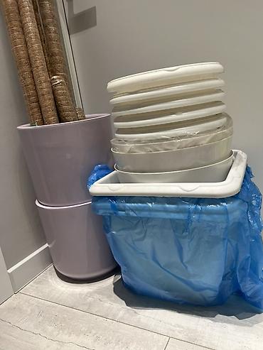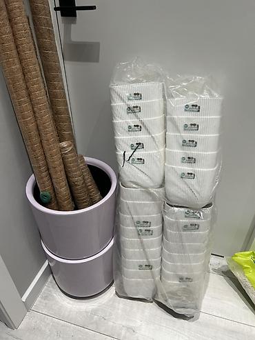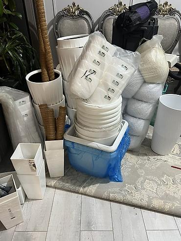 - Кашпо и горшки белые разных форм и размеров: круглые, квадратные и высокие конусные — множество штук, есть модели с внутренними вставками/вкладышами.
