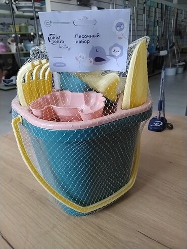 Набор для игр в песочнице включает в себя ведро из прочного пластика с удобной ручкой, лопатку, грабли и формочки в виде морских обитателей. Цвета набора – приглушенный бирюзовый, желтый и розовый. Идеален для развития моторики и воображения детей во время игр на свежем воздухе.