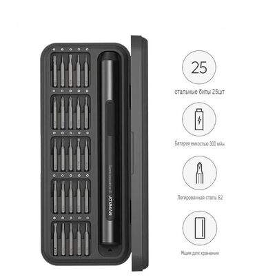 ATuMan Electric Precision Screwdriver Set E1 Электрическая портативная отвертка с набором из 25 бит. Благодаря сменным насадкам инструмент станет универсальным в быту для выполнения самых разнообразных задач по дому. Управление одной кнопкой Имеет простое управление одной кнопкой питания и кнопками управления вращением. Это позволяет использовать модель одной рукой. 210 об/мин. Отвёртка обладает мощным встроенным двигателем 210 об/мин, что обеспечивает быструю и эффективную работу без нагрузки. Богатая комплектация В комплект модели входит минималистичный магнитный контейнер для удобного хранения набора из 25 бит, который предотвращает их выпадение при эксплуатации. Сами биты изготовлены из прочной высококачественной стали S2. В наборе находятся 25 бит – PH000, PH00, PH0, PH1, PH2, SL1.5, SL2.0, H0.7, H0.9, H1.5, H2.0, T2, T3, T4, T5H, T6H, T8H, T9H, Y10H, P2, P5, Y0.6, W1.5, TW1, 2.2. Характеристики Форма отвертки прямая Тип питания аккумулятор Тип патрона под биты Устройство аккумулятора встроенный