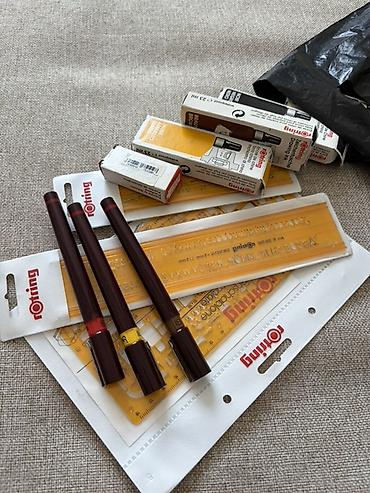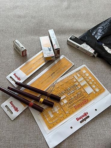 - Трафареты/линейки Rotring из жёлтого прозрачного пластика: универсальные трафареты с геометрическими фигурами, буквенно-цифровыми символами и разметкой; длинная тонкая линейка с миллиметровой шкалой.
