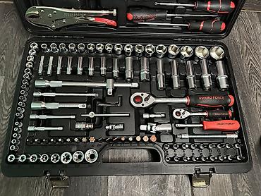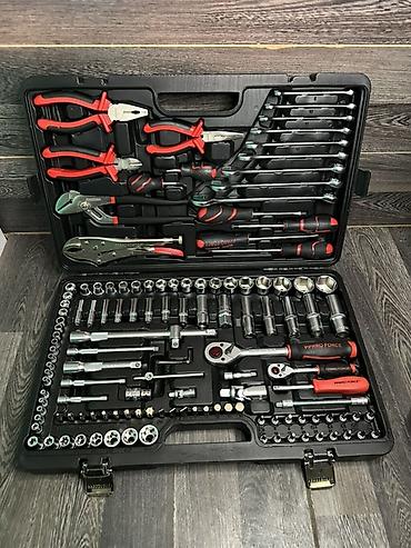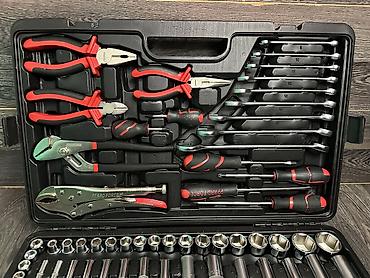 Комплект в прочном пластиковом чемодане с металлическими замками, включает широкий ассортимент слесарных и автомобильных инструментов: