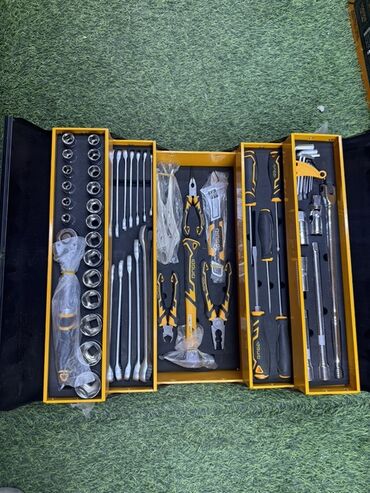 в желтом металлическом ящике. Включает в себя широкий выбор торцевых головок, гаечных ключей, отверток, плоскогубцев, молоток и другие инструменты, необходимые для выполнения различных ремонтных и строительных работ. Инструменты аккуратно размещены в отделениях ящика, что обеспечивает удобство хранения и транспортировки. Подходит для использования как дома, так и в мастерской или гараже Доставка бесплатно.